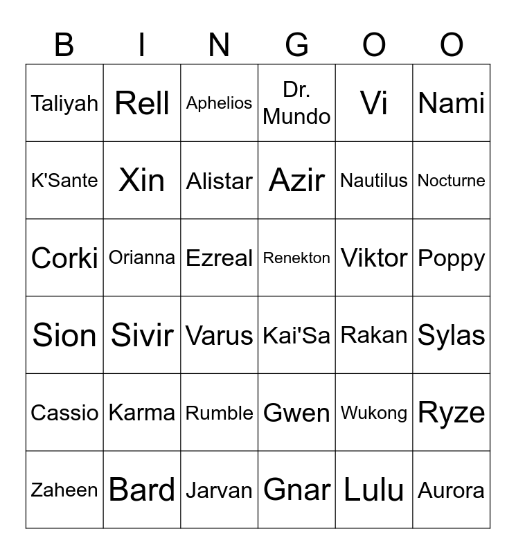 This bingo card has 36 words: Gwen, Rumble, Gnar, K'Sante, Sion, Renekton, Xin, Jarvan, Vi, Wukong, Nocturne, Dr. Mundo, Ryze, Orianna, Azir, Taliyah, Cassio, Viktor, Corki, Aphelios, Ezreal, Sivir, Kai'Sa, Varus, Rakan, Rell, Nautilus, Bard, Alistar, Nami, Aurora, Zaheen, Sylas, Poppy, Karma and Lulu.