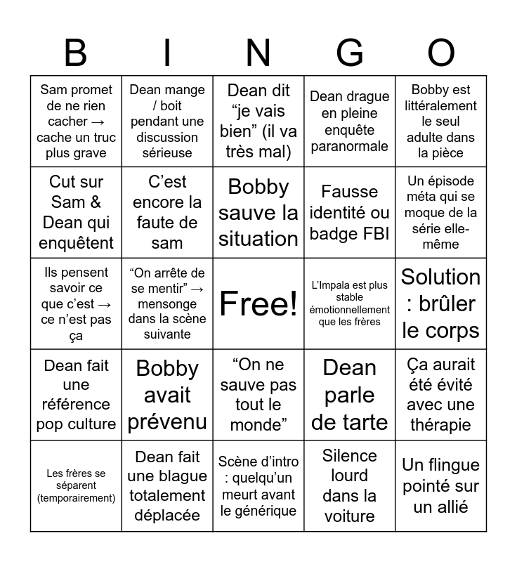 This bingo card has a free space and 36 words: Liste case, Bobby fait une remarque paternel, Putain mais dites vous « je t’aime » !, C’est encore la faute de sam, Dean parle de tarte, Dean fait une référence pop culture, Bobby sauve la situation, Sam et Dean mentent à Bobby, Bobby est littéralement le seul adulte dans la pièce, “On avait pas le choix” (ils avaient le choix), “On arrête de se mentir” → mensonge dans la scène suivante, Dean drague en pleine enquête paranormale, Bobby dit une vérité que personne n’écoute, L’Impala est plus stable émotionnellement que les frères, Un épisode méta qui se moque de la série elle-même, Sam promet de ne rien cacher → cache un truc plus grave, Les frères se disputent dans un motel, Bobby avait prévenu, Un flingue pointé sur un allié, Dean dit “je vais bien” (il va très mal), Solution : brûler le corps, Ça aurait été évité avec une thérapie, Dean fait une blague totalement déplacée, Les frères se séparent (temporairement), Scène d’intro : quelqu’un meurt avant le générique, Dean mange / boit pendant une discussion sérieuse, Ils pensent savoir ce que c’est → ce n’est pas ça, Recherche Google version 2007, Fausse identité ou badge FBI, Cut sur Sam & Dean qui enquêtent, Sam explique le lore/légende pendant que Dean fait autre chose, La créature est plus forte que prévu, Silence lourd dans la voiture, “On ne sauve pas tout le monde”, Ils mentionnent l’apocalypse/la fin du monde and Les frère tombent dans un piège, il était pas assez beaucoup trop fort.