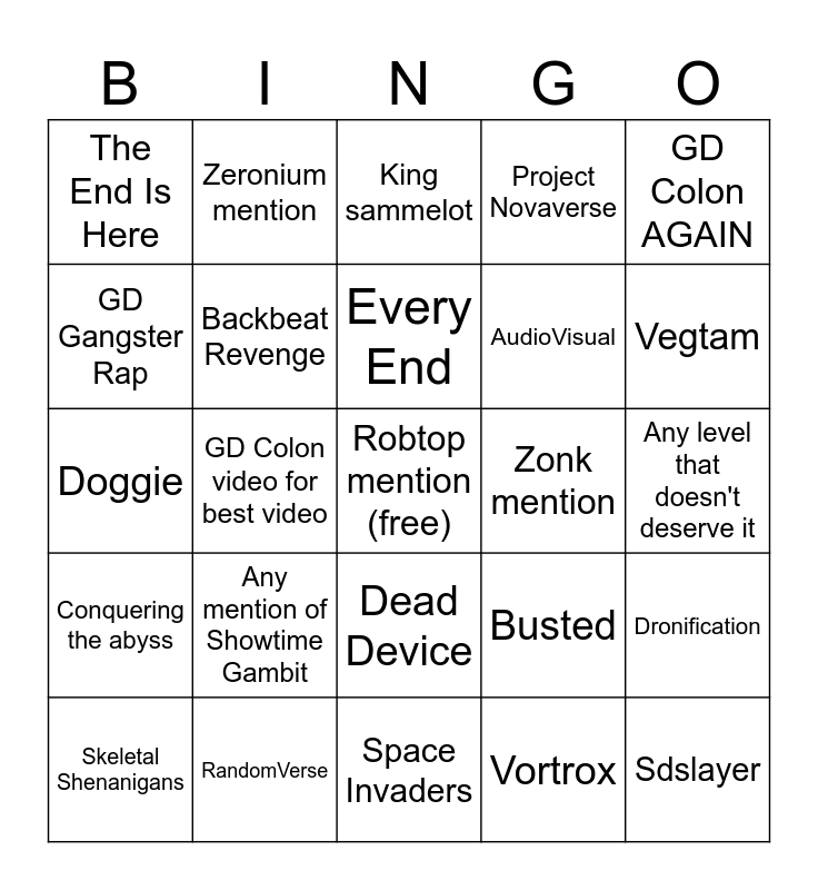 This bingo card has a free space and 24 words: Any mention of Showtime Gambit, RandomVerse, Every End, Skeletal Shenanigans, GD Colon AGAIN, The End Is Here, GD Gangster Rap, Zeronium mention, Zonk mention, Dead Device, AudioVisual, Doggie, Busted, Dronification, Backbeat Revenge, Vortrox, Any level that doesn't deserve it, King sammelot, Vegtam, GD Colon video for best video, Sdslayer, Conquering the abyss, Project Novaverse and Space Invaders.