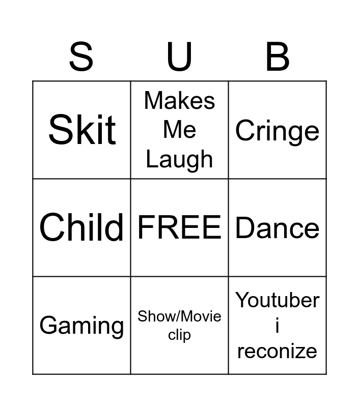 This bingo card has a free space and 8 words: Dance, Cringe, Makes Me Laugh, Gaming, Skit, Youtuber i reconize, Child and Show/Movie clip.