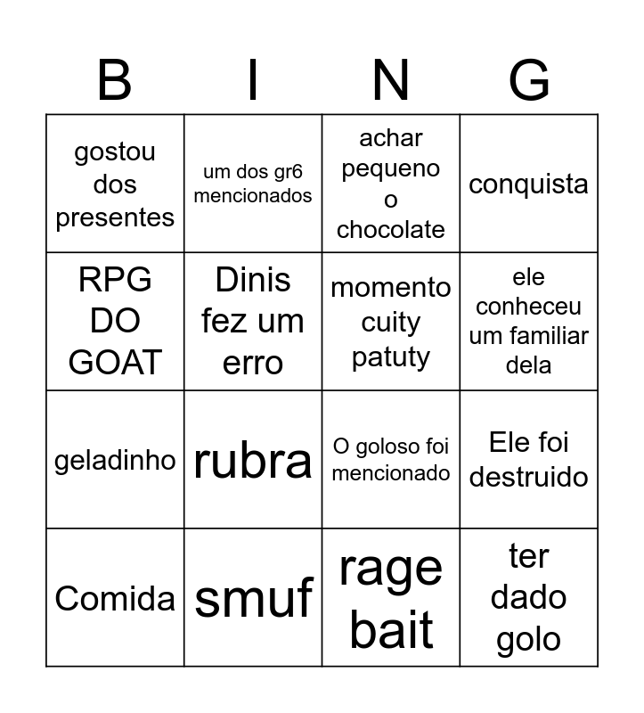 This bingo card has 16 words: smuf, Ele foi destruido, achar pequeno o chocolate, gostou dos presentes, geladinho, um dos gr6 mencionados, O goloso foi mencionado, rage bait, RPG DO GOAT, Dinis fez um erro, Comida, conquista, rubra, ele conheceu um familiar dela, momento cuity patuty and ter dado golo.