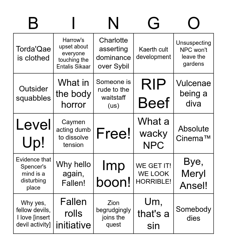 This bingo card has a free space and 24 words: Why hello again, Fallen!, Fallen rolls initiative, Someone is rude to the waitstaff (us), Why yes, fellow devils, I love [insert devil activity], Unsuspecting NPC won't leave the gardens, Torda'Qae is clothed, Outsider squabbles, Harrow's upset about everyone touching the Entalis Sikaar, What a wacky NPC, Imp boon!, RIP Beef, Level Up!, WE GET IT! WE LOOK HORRIBLE!, Bye, Meryl Ansel!, What in the body horror, Um, that's a sin, Absolute Cinema™, Charlotte asserting dominance over Sybil, Vulcenae being a diva, Caymen acting dumb to dissolve tension, Somebody dies, Evidence that Spencer's mind is a disturbing place, Kaerth cult development and Zion begrudgingly joins the quest.