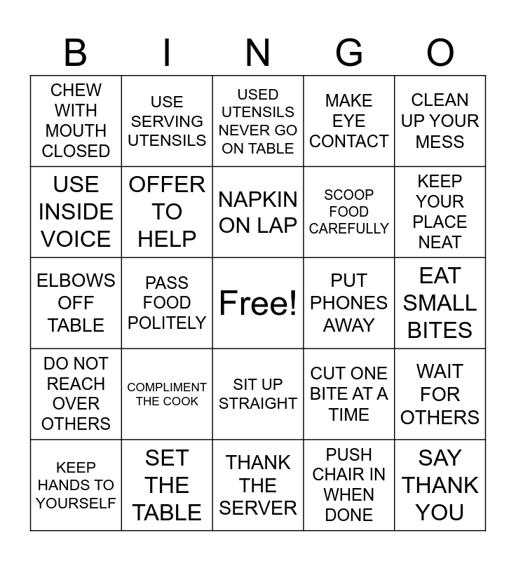 This bingo card has a free space and 40 words: SAY PLEASE, ELBOWS OFF TABLE, SHAKERS GO TOGETHER, OFFER TO HELP, SET THE TABLE, SIT UP STRAIGHT, NAPKIN ON LAP, LISTEN TO OTHERS, CLEAN UP YOUR MESS, DO NOT REACH OVER OTHERS, PASS FOOD POLITELY, MAKE EYE CONTACT, SAY THANK YOU, EAT SMALL BITES, PUT PHONES AWAY, COMPLIMENT THE COOK, SAY EXCUSE ME, CHEW WITH MOUTH CLOSED, ASK POLITE QUESTIONS, USED UTENSILS NEVER GO ON TABLE, WAIT FOR OTHERS, PUSH CHAIR IN WHEN DONE, SCOOP FOOD CAREFULLY, USE INSIDE VOICE, ASK BEFORE LEAVING TABLE, WAIT YOUR TURN TO SPEAK, TRY A BITE, USE YOUR UTENSILS, KEEP FOOD ON YOUR PLATE, PASS TO THE RIGHT, HOLD DOOR FOR OTHERS, KEEP HANDS TO YOURSELF, PLACE NAPKIN BESIDE PLATE WHEN FINISHED, CUT ONE BITE AT A TIME, KEEP YOUR PLACE NEAT, THANK THE SERVER, USE KIND WORDS, CHEW QUIETLY, USE SERVING UTENSILS and KEEP FEET ON FLOOR.