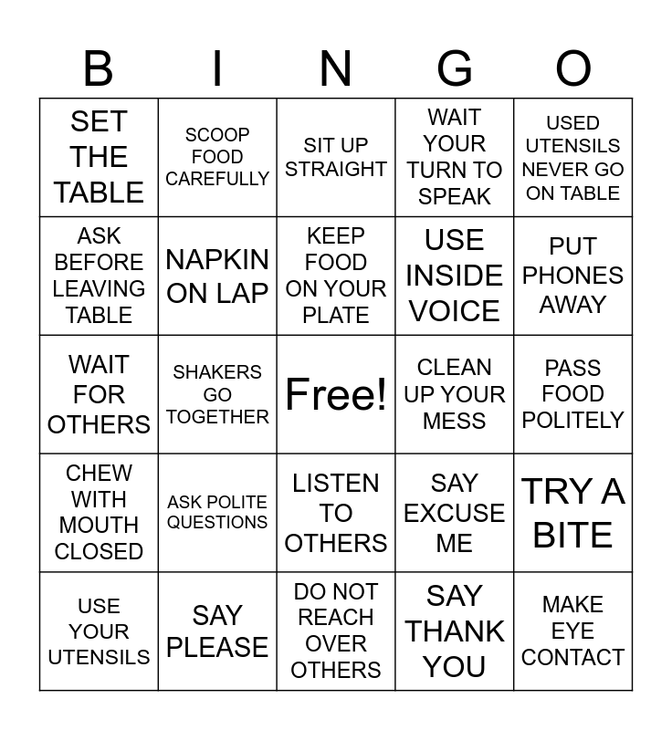 This bingo card has a free space and 30 words: SAY PLEASE, ELBOWS OFF TABLE, SHAKERS GO TOGETHER, OFFER TO HELP, SET THE TABLE, SIT UP STRAIGHT, NAPKIN ON LAP, LISTEN TO OTHERS, CLEAN UP YOUR MESS, DO NOT REACH OVER OTHERS, PASS FOOD POLITELY, MAKE EYE CONTACT, SAY THANK YOU, EAT SMALL BITES, PUT PHONES AWAY, COMPLIMENT THE COOK, SAY EXCUSE ME, CHEW WITH MOUTH CLOSED, ASK POLITE QUESTIONS, USED UTENSILS NEVER GO ON TABLE, WAIT FOR OTHERS, PUSH CHAIR IN WHEN DONE, SCOOP FOOD CAREFULLY, USE INSIDE VOICE, ASK BEFORE LEAVING TABLE, WAIT YOUR TURN TO SPEAK, TRY A BITE, USE YOUR UTENSILS, KEEP FOOD ON YOUR PLATE and PASS TO THE RIGHT.