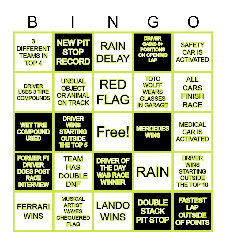 This bingo card has a free space and 79 words: CADILLAC DRIVER DNF, CAR ON FIRE (INCLUDES BRAKES), RAIN DELAY, TEAM BOSS ON CAMERA, FERRARI STRATEGY BLUNDER, 5 SECOND DRIVER PENALTY, 15+ SECOND PIT STOP, DRIVER STARTS FROM PIT LANE, TEAMMATES TOUCH, TEAMMATES ON PODIUM, OPENING LAP YELLOW FLAG, 10 SECOND DRIVER PENALTY, DRIVER GAINS 5+ POSITIONS ON OPENING LAP, 3 DIFFERENT TEAMS IN TOP 4, GIRLFRIEND SHOWN DURING RACE, DRIVER USES 3 TIRE COMPOUNDS, DRIVER STUCK IN GRAVEL OR GRASS (NOT A CRASH), TEAM HAS DOUBLE DNF, CELEBRITY SHOWN DURING RACE, MEDICAL CAR IS ACTIVATED, CAR GOES AIRBORNE OR FLIPS, SAFETY CAR IS ACTIVATED, WET TIRE COMPOUND USED, RED FLAG, UNSUAL OBJECT OR ANIMAL ON TRACK, DRIVER COMPLAINS ABOUT THEIR CAR, ZAC BROWN FIST PUMP, FAN SIGN SHOW ON TV BROADCAST, VIRTUAL SAFETY CAR, PAPAYA RULES, ALL CARS FINISH RACE, MAX WINS, LANDO WINS, OSCAR WINS, FERRARI WINS, MERCEDES WINS, NO MCL, RB, FERRARI, OR MERCEDES WIN, PIT RELEASE PENALTY, DRIVERS CRASH INTO EACH OTHER, FASTEST LAP OUTSIDE OF POINTS, FASTEST LAP BY A TOP 3 DRIVER, DRIVER CURSES ON TEAM RADIO, SPECIAL TEAM LIVERY OR DRIVER SUIT, TEAM ORDERS DRIVERS TO SWITCH POSITIONS, UNDERCUT EXECUTED SUCCESFULLY, NEW PIT STOP RECORD, DRIVER LEADS EVERY LAP, NEW TOP SPEED RECORD, DRIVER GRAND SLAM (POLE, WIN, FASTEST LAP), LEWIS SAYS TIRES ARE BAD, DRIVER WINS STARTING OUTSIDE THE TOP 10, DRIVER WINS STARTING OUTSIDE THE TOP 5, RAIN, DRIVER HITS PODIUM POSITION POST WITH CAR, FIRST TIME RACE WINNER, MAX SQUEEZES DRIVER, TIRE PUNCTURE, LOCKUP ENTERING PIT LANE, DRIVER OF THE DAY WASN'T RACE WINNER, DRIVER OF THE DAY WAS RACE WINNER, TOTO WOLFF WEARS GLASSES IN GARAGE, BLUE FLAGS, FAKE PIT STOP, CAR MAKES SPARKS, Driver told me to stay off Curbs, Driver told to lift and coast, DRIVER GETS A MOTORCYCLE RIDE, FRONT WING CHANGE, RESERVE DRIVER SHOWN DURING RACE, FORMER F1 DRIVER DOES POST RACE INTERVIEW, MUSICAL ARTIST WAVES CHEQUERED FLAG, ACTOR WAVES CHEQUERED FLAG, ATHLETE WAVES CHEQUERED FLAG, CHEEKY ALONSO TEAM RADIO, BLACK FLAGS, DOUBLE STACK PIT STOP, DRIVER SPINS BUT CONTINUES RACE, DRIVER HITS WALL and FEMALE TEAM MEMBER ON PODIUM CELEBRATION.
