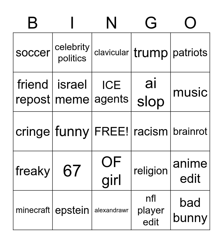 This bingo card has a free space and 24 words: 67, epstein, ICE agents, minecraft, patriots, soccer, friend repost, celebrity politics, racism, OF girl, ai slop, cringe, religion, anime edit, israel meme, nfl player edit, brainrot, clavicular, music, funny, bad bunny, freaky, trump and alexandrawr.