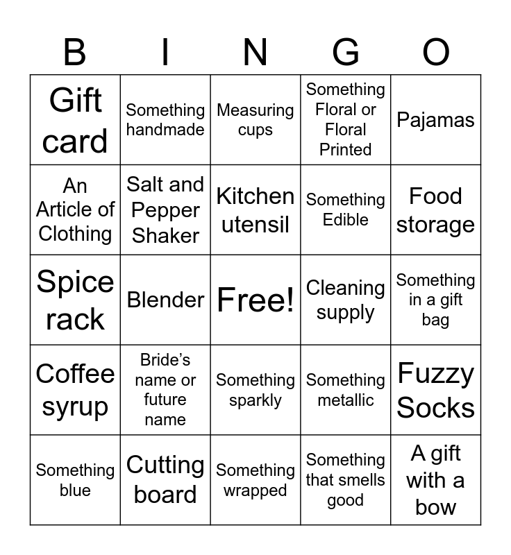 This bingo card has a free space and 33 words: Robe, Toaster, Blender, Coffee, Coffee syrup, Salt and Pepper Shaker, Pajamas, Something blue, Something handmade, Towels, Kitchen utensil, Measuring cups, Something soft, Pots or Pans, Cleaning supply, Food storage, Cutting board, Spice rack, Bride’s name or future name, Something metallic, Something sparkly, Something sentimental, Gift card, Something in a gift bag, Something wrapped, A gift with a bow, Something Floral or Floral Printed, Something Edible, An Article of Clothing, Fuzzy Socks, A Blanket, Something that smells good and A set of something.