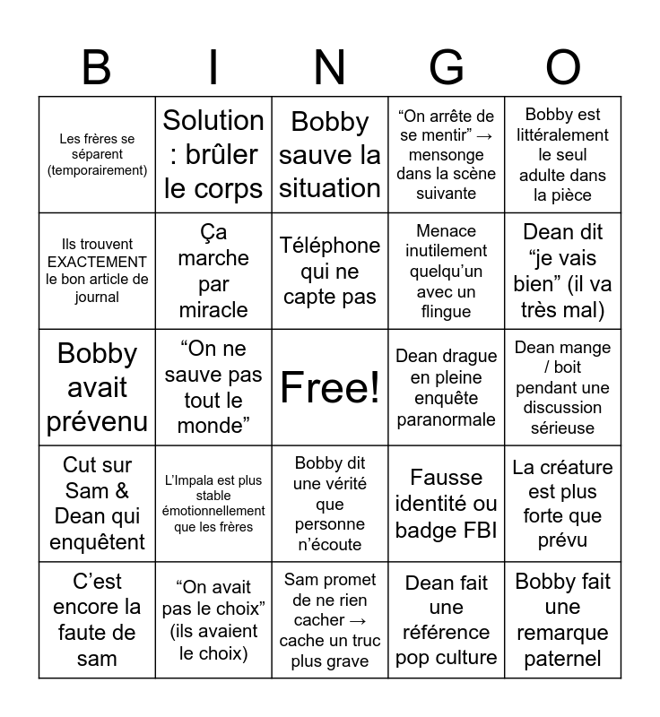 This bingo card has a free space and 43 words: Liste case, Bobby fait une remarque paternel, Putain mais dites vous « je t’aime » !, C’est encore la faute de sam, Dean parle de tarte, Dean fait une référence pop culture, Bobby sauve la situation, Sam et Dean mentent à Bobby, Bobby est littéralement le seul adulte dans la pièce, “On avait pas le choix” (ils avaient le choix), “On arrête de se mentir” → mensonge dans la scène suivante, Dean drague en pleine enquête paranormale, Bobby dit une vérité que personne n’écoute, L’Impala est plus stable émotionnellement que les frères, Un épisode méta qui se moque de la série elle-même, Sam promet de ne rien cacher → cache un truc plus grave, Les frères se disputent dans un motel, Bobby avait prévenu, Un flingue pointé sur un allié, Dean dit “je vais bien” (il va très mal), Solution : brûler le corps, Ça aurait été évité avec une thérapie, Dean fait une blague totalement déplacée, Les frères se séparent (temporairement), Scène d’intro : quelqu’un meurt avant le générique, Dean mange / boit pendant une discussion sérieuse, Ils pensent savoir ce que c’est → ce n’est pas ça, Recherche Google version 2007, Fausse identité ou badge FBI, Cut sur Sam & Dean qui enquêtent, Sam explique le lore/légende pendant que Dean fait autre chose, La créature est plus forte que prévu, Silence lourd dans la voiture, “On ne sauve pas tout le monde”, Ils mentionnent l’apocalypse/la fin du monde, Les frère tombent dans un piège, il était pas assez beaucoup trop fort, Bruit étrange → ils disent “t’as entendu ?”, Téléphone qui ne capte pas, Ils trouvent EXACTEMENT le bon article de journal, Menace inutilement quelqu’un avec un flingue, Sam hallucine les enfers, Ça marche par miracle and Discussion morale dans la voiture.