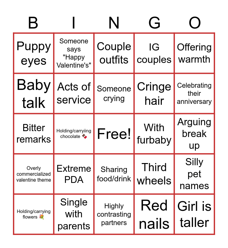 This bingo card has a free space and 29 words: Holding/carrying flowers 💐, Holding/carrying plushies 🐻, Holding/carryiing chocolate 🍫, Asking someone out, Puppy eyes, Couple outfits, Acts of service, Extreme PDA, With furbaby, Single with parents, Arguing break up, Girl is taller, Highly contrasting partners, Red nails, Celebrating their anniversary, Someone holding a sign, Sharing food/drink, Overly commercialized valentine theme, Offering warmth, Bitter remarks, Third wheels, Mullet guy & Sabrina Carpenter girl, Cringe hair, Baby talk, IG couples, Someone says "Happy Valentine's", Silly pet names, Someone crying and Full family outing.