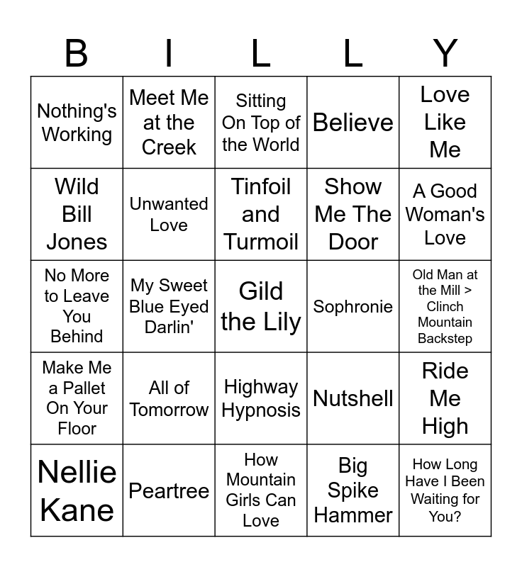 This bingo card has a free space and 24 words: All of Tomorrow, Peartree, Tinfoil and Turmoil, Nellie Kane, Love Like Me, Nothing's Working, Wild Bill Jones, Meet Me at the Creek, Sophronie, Highway Hypnosis, Show Me The Door, No More to Leave You Behind, Nutshell, Ride Me High, Unwanted Love, Big Spike Hammer, Old Man at the Mill > Clinch Mountain Backstep, Sitting On Top of the World, A Good Woman's Love, My Sweet Blue Eyed Darlin', How Long Have I Been Waiting for You?, Make Me a Pallet On Your Floor, Believe and How Mountain Girls Can Love.