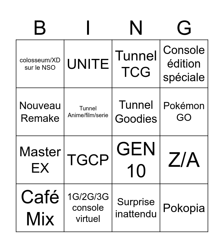 This bingo card has 16 words: 1G/2G/3G console virtuel, Z/A, Tunnel TCG, colosseum/XD sur le NSO, Master EX, UNITE, GEN 10, Surprise inattendu, Nouveau Remake, Tunnel Anime/film/serie, Café Mix, Console édition spéciale, TGCP, Pokémon GO, Tunnel Goodies and Pokopia.