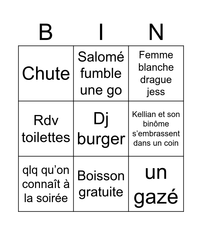 This bingo card has a free space and 8 words: Kellian et son binôme s’embrassent dans un coin, Femme blanche drague jess, Salomé fumble une go, qlq qu’on connaît à la soirée, Chute, un gazé, Rdv toilettes and Boisson gratuite.