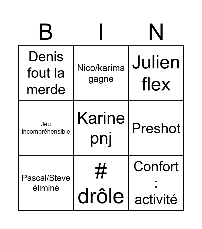 This bingo card has a free space and 8 words: Preshot, Julien flex, Nico/karima gagne, Pascal/Steve éliminé, Denis fout la merde, Confort : activité, Jeu incompréhensible and # drôle.