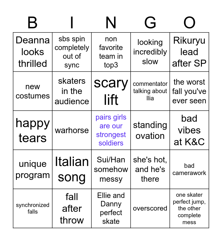This bingo card has a free space and 26 words: Sui/Han somehow messy, overscored, scary lift, fall after throw, Rikuryu lead after SP, Deanna looks thrilled, new costumes, sbs spin completely out of sync, bad vibes at K&C, she's hot, and he's there, commentator talking about Ilia, happy tears, bad camerawork, synchronized falls, warhorse, aborted lift, looking incredibly slow, unique program, non favorite team in top3, one skater perfect jump, the other complete mess, the worst fall you've ever seen, Ellie and Danny perfect skate, standing ovation, Italian song, skaters in the audience and wholesome coach reaction.
