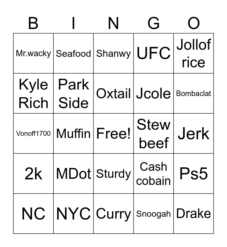 This bingo card has a free space and 24 words: MDot, NYC, Oxtail, NC, Jollof rice, Mr.wacky, Kyle Rich, Seafood, Stew beef, Sturdy, Jcole, Vonoff1700, Cash cobain, Ps5, Park Side, Snoogah, Jerk, Shanwy, Bombaclat, Muffin, Drake, 2k, UFC and Curry.