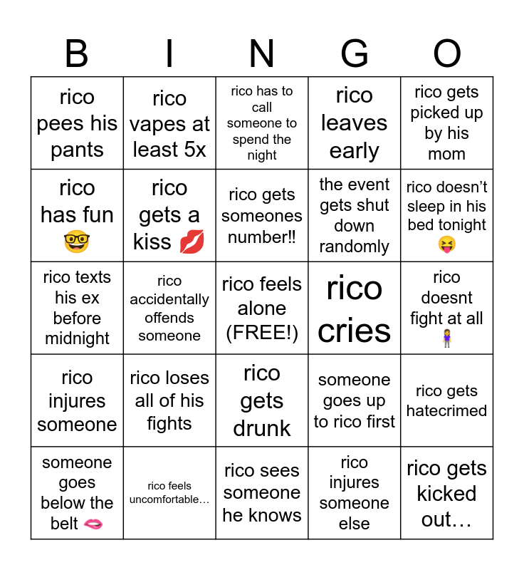 This bingo card has a free space and 24 words: rico loses all of his fights, rico feels uncomfortable…, rico gets someones number‼️, someone goes below the belt 🫦, rico gets picked up by his mom, rico pees his pants, rico has fun🤓, rico vapes at least 5x, rico cries, rico gets drunk, the event gets shut down randomly, rico texts his ex before midnight, someone goes up to rico first, rico gets hatecrimed, rico gets a kiss 💋, rico injures someone else, rico doesnt fight at all 🧍♀️, rico has to call someone to spend the night, rico doesn’t sleep in his bed tonight 😝, rico accidentally offends someone, rico gets kicked out…, rico injures someone, rico leaves early and rico sees someone he knows.