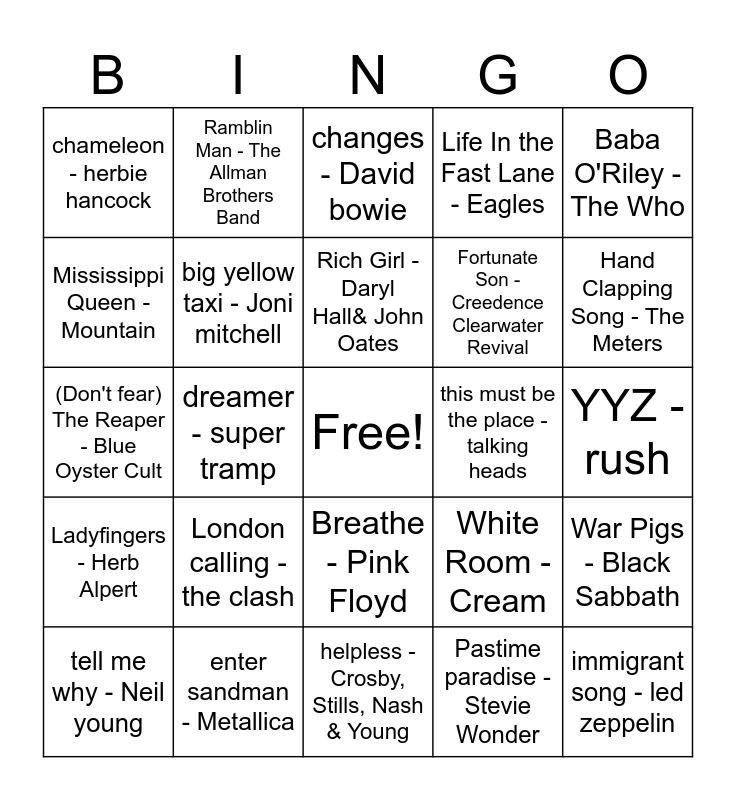 This bingo card has a free space and 29 words: tell me why - Neil young, reelin in the years - steely dan, dreamer - super tramp, fifty-mission cap - the tragically hip, chameleon - herbie hancock, changes - David bowie, big yellow taxi - Joni mitchell, London calling - the clash, this must be the place - talking heads, enter sandman - Metallica, YYZ - rush, immigrant song - led zeppelin, helpless - Crosby, Stills, Nash & Young, Pastime paradise - Stevie Wonder, Hand Clapping Song - The Meters, Everywhere - Fleetowood Mac, Breathe - Pink Floyd, Ladyfingers - Herb Alpert, Baba O'Riley - The Who, (Don't fear) The Reaper - Blue Oyster Cult, White Room - Cream, Purple Haze - Jimi Hendrix, Fortunate Son - Creedence Clearwater Revival, Mississippi Queen - Mountain, Life In the Fast Lane - Eagles, Ramblin Man - The Allman Brothers Band, War Pigs - Black Sabbath, Rich Girl - Daryl Hall& John Oates and Rainbow In The Dark - Did.