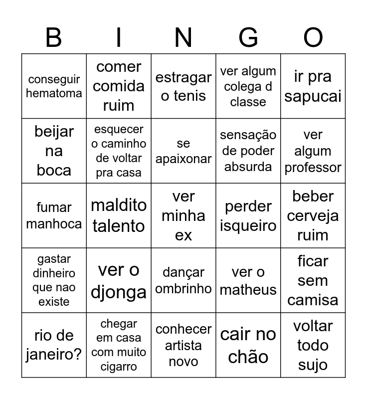 This bingo card has a free space and 24 words: ver o djonga, chegar em casa com muito cigarro, se apaixonar, rio de janeiro?, ir pra sapucai, conseguir hematoma, beijar na boca, comer comida ruim, perder isqueiro, dançar ombrinho, sensação de poder absurda, fumar manhoca, ver o matheus, ficar sem camisa, esquecer o caminho de voltar pra casa, cair no chão, beber cerveja ruim, estragar o tenis, ver algum professor, maldito talento, voltar todo sujo, gastar dinheiro que nao existe, ver algum colega d classe and conhecer artista novo.