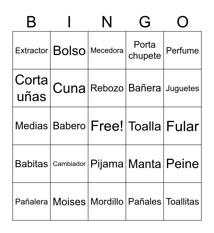 This bingo card has a free space and 40 words: Coche, Medias, Jabón, Cuna, Moises, Pijama, Rebozo, Silla de comer, Perfume, Babitas, Babero, Porta chupete, Toallitas, Fular, Toalla, Cambiador, Colecho, Extractor, Cupete, Mecedora, Peine, Pañales, Bañera, Corta uñas, Algodón, Óleo, Porta chupetes, Mamadera, Pelele, Termómetro, Body, Pañalera, Silla para auto, Manta, Juguetes, Mordillo, Gorro, Formula, Bolso and Talco.