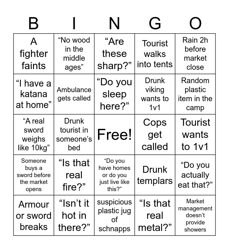 This bingo card has a free space and 24 words: “Is that real fire?”, “Isn’t it hot in there?”, “Do you sleep here?”, Armour or sword breaks, Rain 2h before market close, A fighter faints, “I have a katana at home”, “No wood in the middle ages”, Cops get called, “Do you have homes or do you just live like this?”, Drunk viking wants to 1v1, “A real sword weighs like 10kg”, Drunk templars, “Do you actually eat that?”, Ambulance gets called, “Is that real metal?”, Tourist wants to 1v1, “Are these sharp?”, Random plastic item in the camp, Drunk tourist in someone’s bed, Market management doesn’t provide showers, Someone buys a sword before the market opens, Tourist walks into tents and suspicious plastic jug of schnapps.