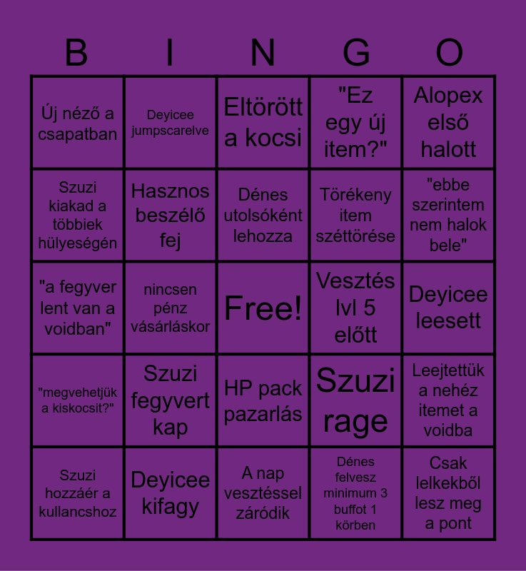 This bingo card has a free space and 24 words: Szuzi fegyvert kap, Deyicee kifagy, Dénes utolsóként lehozza, Szuzi hozzáér a kullancshoz, Alopex első halott, Új néző a csapatban, Szuzi kiakad a többiek hülyeségén, Deyicee jumpscarelve, Vesztés lvl 5 előtt, HP pack pazarlás, Törékeny item széttörése, "a fegyver lent van a voidban", Szuzi rage, Leejtettük a nehéz itemet a voidba, Hasznos beszélő fej, Dénes felvesz minimum 3 buffot 1 körben, Deyicee leesett, Eltörött a kocsi, "ebbe szerintem nem halok bele", nincsen pénz vásárláskor, Csak lelkekből lesz meg a pont, "megvehetjük a kiskocsit?", "Ez egy új item?" and A nap vesztéssel záródik.