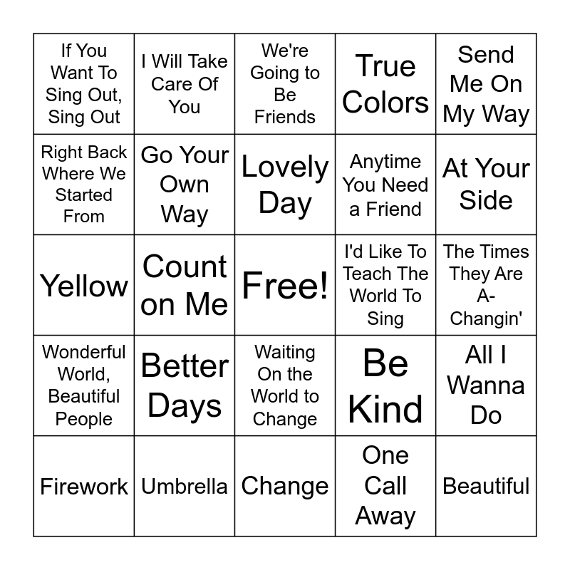 This bingo card has a free space and 70 words: Won't You Be My Neighbor?, The Times They Are A-Changin', You've Got The Love, Born This Way, Umbrella, Same Love, True Colors, Redbone, Send Me On My Way, Pink Pony Club, All I Wanna Do, I Am What I Am, If You Want To Sing Out, Sing Out, We're Going to Be Friends, That's What Friends Are For, Count on Me, Waiting On the World to Change, Anytime You Need a Friend, What the World Needs Now (Is Love), Wonderful World, Beautiful People, I'd Like To Teach The World To Sing, Be Kind, At Your Side, Kind & Generous, You Are Loved, Put A Little Love In Your Heart, Never Gonna Let You Down, He Ain't Heavy He's My Brother, One Call Away, Hold My Hand, I Will Take Care Of You, A Million Dreams, Oh, Freedom, It's Not Unusual, Crowded Table, You Get What You Give, Wouldn't It Be Nice, All You Need Is Love, We Belong, Right Back Where We Started From, I Got You Babe, Better Days, Beautiful, Rainbow, Lean on Me, Go Your Own Way, Firework, Where You Lead, You Can't Always Get What You Want, Goodbye Stranger, Walk On the Wild Side, You've Got a Friend, Stuck with U, The Luckiest, Change, I Still Haven't Found What I'm Looking For, Lovely Day, Home, Ho Hey, All My Love, Yellow, BIRDS OF A FEATHER, Faith, With My Own Two Hands, You Can't Make Old Friends, Follow Your Arrow, You Need To Calm Down, Who You Are, Hey Brother and Help Is On The Way.