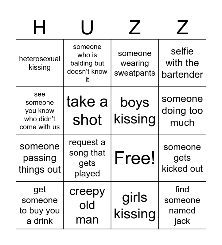 This bingo card has 21 words: creepy old man, pull a prank on someone, someone who is balding but doesn’t know it, a couple, girls kissing, boys kissing, heterosexual kissing, someone wearing sweatpants, Free!, someone doing too much, someone passing things out, selfie with the bartender, find someone named jack, ask someone to teach you how to dougie, take a shot, see someone from a dating app, get someone to buy you a drink, request a song that gets played, see someone you know who didn’t come with us, someone gets kicked out and see an opp.