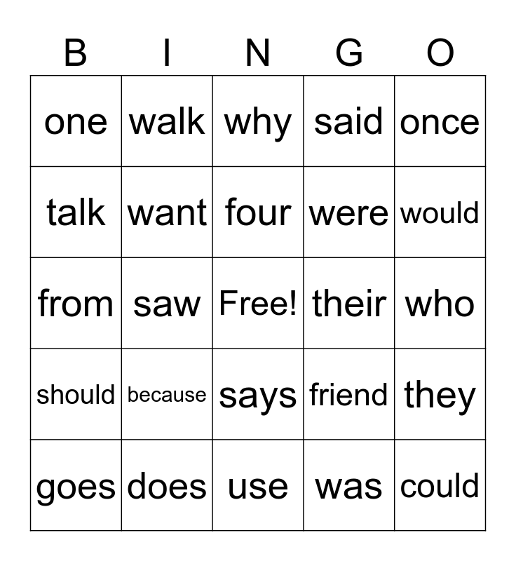 This bingo card has a free space and 24 words: because, does, four, goes, once, one, talk, walk, their, says, were, from, friend, they, want, was, who, why, would, saw, could, should, said and use.