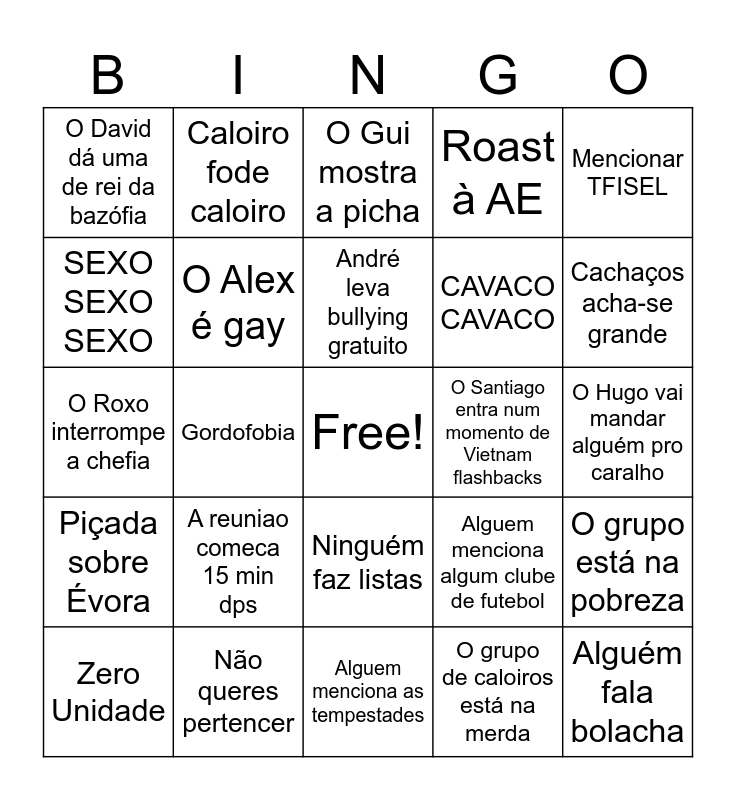 This bingo card has a free space and 24 words: Zero Unidade, A reuniao comeca 15 min dps, André leva bullying gratuito, O grupo de caloiros está na merda, Mencionar TFISEL, O David dá uma de rei da bazófia, Caloiro fode caloiro, O Gui mostra a picha, O Santiago entra num momento de Vietnam flashbacks, O Hugo vai mandar alguém pro caralho, O Roxo interrompe a chefia, O Alex é gay, Alguem menciona algum clube de futebol, O grupo está na pobreza, SEXO SEXO SEXO, Não queres pertencer, Alguem menciona as tempestades, Roast à AE, Cachaços acha-se grande, Piçada sobre Évora, Gordofobia, Ninguém faz listas, CAVACO CAVACO and Alguém fala bolacha.