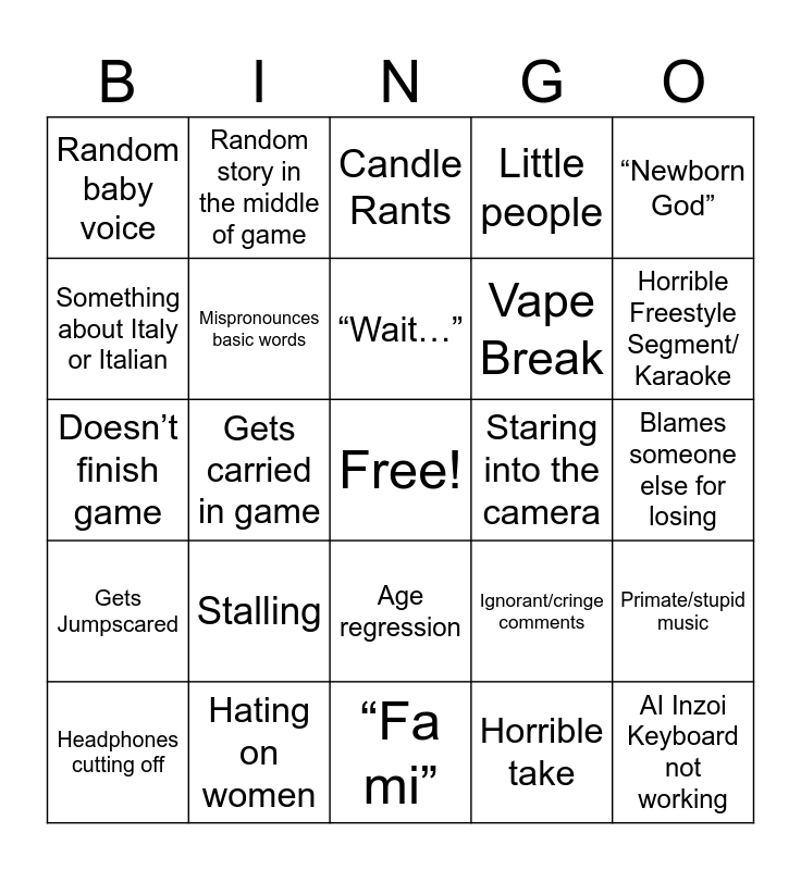 This bingo card has a free space and 24 words: Stalling, Hating on women, “Wait…”, Headphones cutting off, “Newborn God”, Random baby voice, Something about Italy or Italian, Random story in the middle of game, Staring into the camera, Age regression, Vape Break, Doesn’t finish game, Ignorant/cringe comments, Primate/stupid music, Mispronounces basic words, Horrible take, Blames someone else for losing, Candle Rants, Horrible Freestyle Segment/ Karaoke, Gets carried in game, AI Inzoi Keyboard not working, Gets Jumpscared, Little people and “Fa mi”.