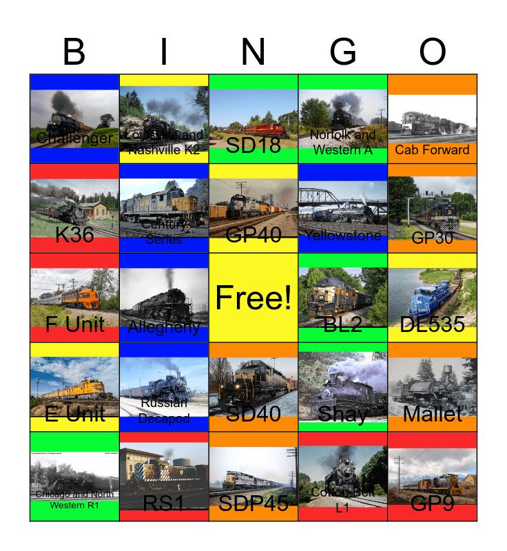 This bingo card has 24 images, a free space and 24 words: Russian Decapod, RS1, GP40, Chicago and North Western R1, Cab Forward, Challenger, K36, Louisville and Nashville K2, BL2, SD40, Yellowstone, F Unit, Shay, Mallet, Century Series, Cotton Belt L1, DL535, SD18, GP30, Allegheny, GP9, E Unit, Norfolk and Western A and SDP45.