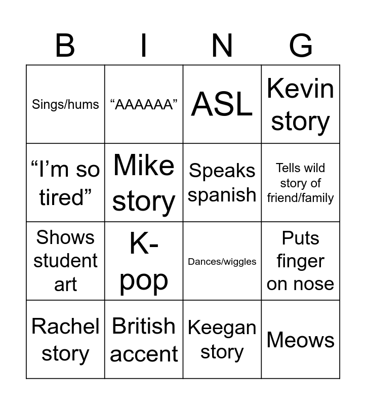 This bingo card has 16 words: British accent, Puts finger on nose, ASL, Sings/hums, Shows student art, “AAAAAA”, Dances/wiggles, Keegan story, “I’m so tired”, Mike story, Rachel story, Kevin story, K-pop, Tells wild story of friend/family, Speaks spanish and Meows.