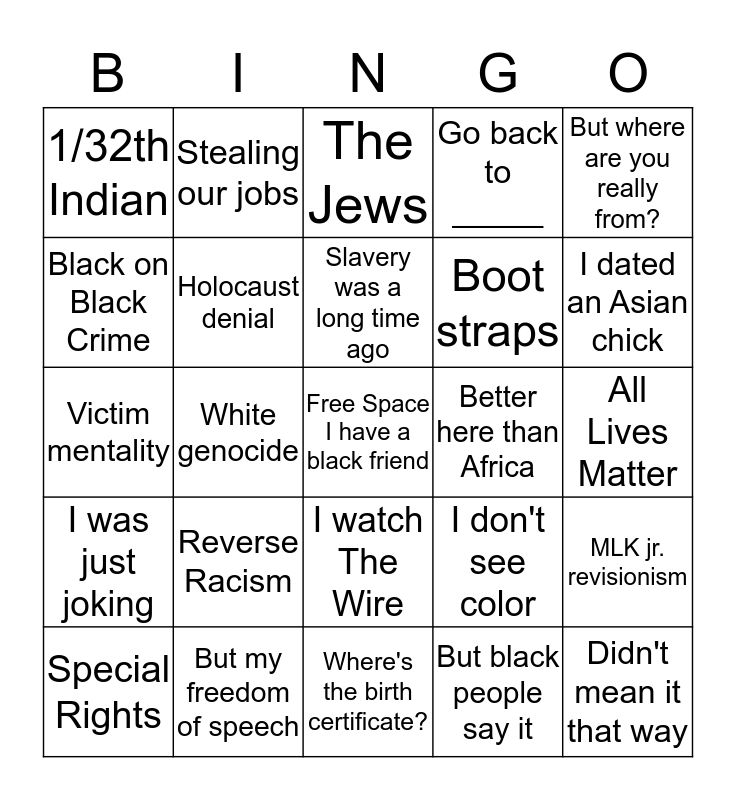 This bingo card has a free space and 24 words: Reverse Racism, But my freedom of speech, Slavery was a long time ago, Special Rights, But where are you really from?, 1/32th Indian, Black on Black Crime, Stealing our jobs, Better here than Africa, I watch The Wire, Boot straps, Victim mentality, I don't see color, MLK jr. revisionism, Holocaust denial, But black people say it, All Lives Matter, The Jews, I dated an Asian chick, White genocide, Didn't mean it that way, I was just joking, Go back to _____ and Where's the birth certificate?.
