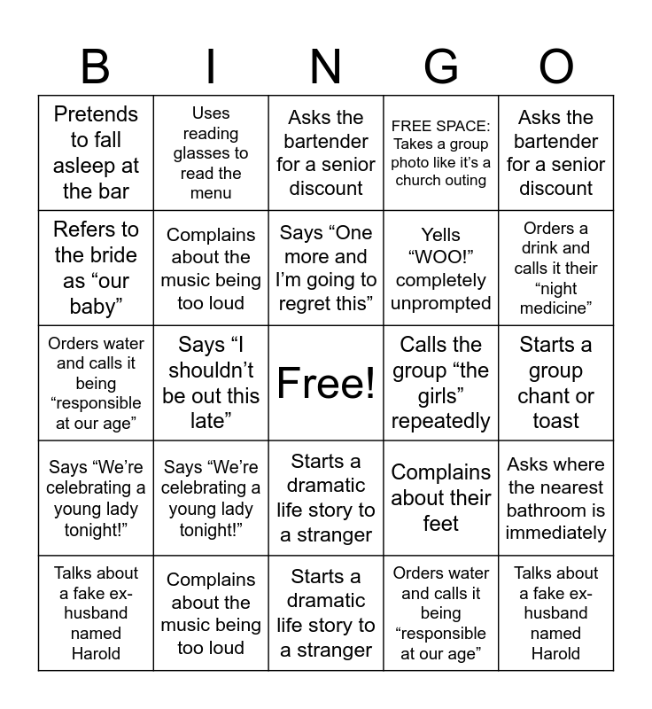 This bingo card has a free space and 48 words: Orders a drink and calls it their “night medicine”, Talks about a fake ex-husband named Harold, Mentions their “hip acting up”, Starts a dramatic life story to a stranger, Says “We’re celebrating a young lady tonight!”, Says “Back in my day…”, Uses reading glasses to read the menu, Flirts with someone 10 years younger, Refers to the bride as “our baby”, Asks someone to take their picture and gives full posing directions, Complains about the music being too loud, FREE SPACE: Takes a group photo like it’s a church outing, Asks where the nearest bathroom is immediately, Complains about their feet, Starts a group chant or toast, Dances way too aggressively to a slow song, Says “One more and I’m going to regret this”, Calls the group “the girls” repeatedly, Talks about needing a good brunch tomorrow, Asks the bartender for a senior discount, Says “I shouldn’t be out this late”, Orders water and calls it being “responsible at our age”, Pretends to fall asleep at the bar, Yells “WOO!” completely unprompted, Talks about arthritis, real or fake, Orders a drink and calls it their “night medicine”, Talks about a fake ex-husband named Harold, Mentions their “hip acting up”, Starts a dramatic life story to a stranger, Says “We’re celebrating a young lady tonight!”, Says “Back in my day…”, Uses reading glasses to read the menu, Flirts with someone 10 years younger, Refers to the bride as “our baby”, Complains about the music being too loud, Asks where the nearest bathroom is immediately, Complains about their feet, Starts a group chant or toast, Dances way too aggressively to a slow song, Says “One more and I’m going to regret this”, Calls the group “the girls” repeatedly, Talks about needing a good brunch tomorrow, Asks the bartender for a senior discount, Says “I shouldn’t be out this late”, Orders water and calls it being “responsible at our age”, Pretends to fall asleep at the bar, Yells “WOO!” completely unprompted and Talks about arthritis, real or fake.