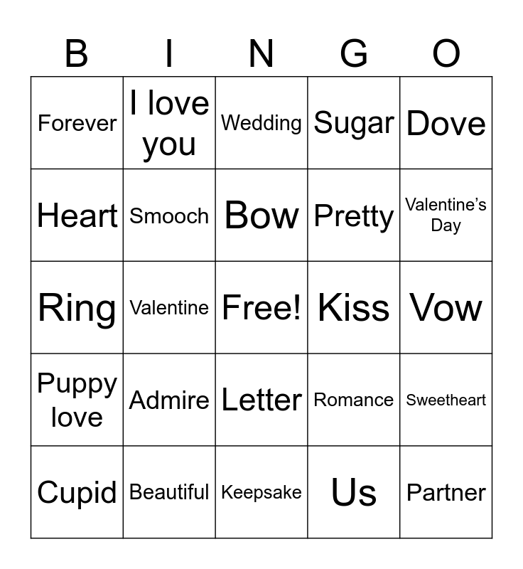 This bingo card has a free space and 24 words: Admire, Beautiful, Bow, Cupid, Dove, Forever, Heart, I love you, Kiss, Letter, Pretty, Ring, Romance, Sweetheart, Smooch, Us, Vow, Wedding, Valentine’s Day, Valentine, Partner, Puppy love, Sugar and Keepsake.