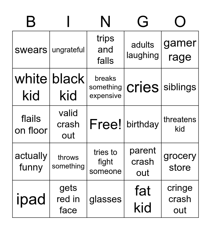 This bingo card has a free space and 24 words: throws something, gets red in face, breaks something expensive, ipad, gamer rage, swears, white kid, ungrateful, birthday, tries to fight someone, cries, flails on floor, parent crash out, grocery store, black kid, fat kid, threatens kid, trips and falls, siblings, valid crash out, cringe crash out, actually funny, adults laughing and glasses.