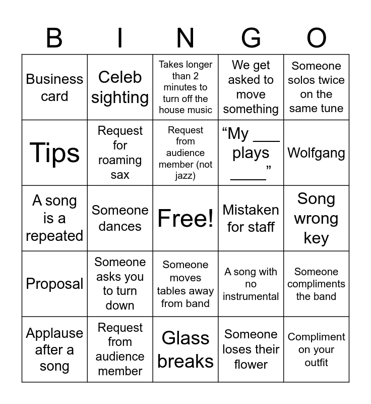 This bingo card has a free space and 24 words: Someone asks you to turn down, Request from audience member, Request from audience member (not jazz), Applause after a song, Someone solos twice on the same tune, Business card, Tips, Celeb sighting, Mistaken for staff, Someone moves tables away from band, “My ___ plays ____”, A song is a repeated, A song with no instrumental, Someone compliments the band, Request for roaming sax, Someone loses their flower, Song wrong key, Takes longer than 2 minutes to turn off the house music, Wolfgang, Someone dances, Compliment on your outfit, Proposal, We get asked to move something and Glass breaks.