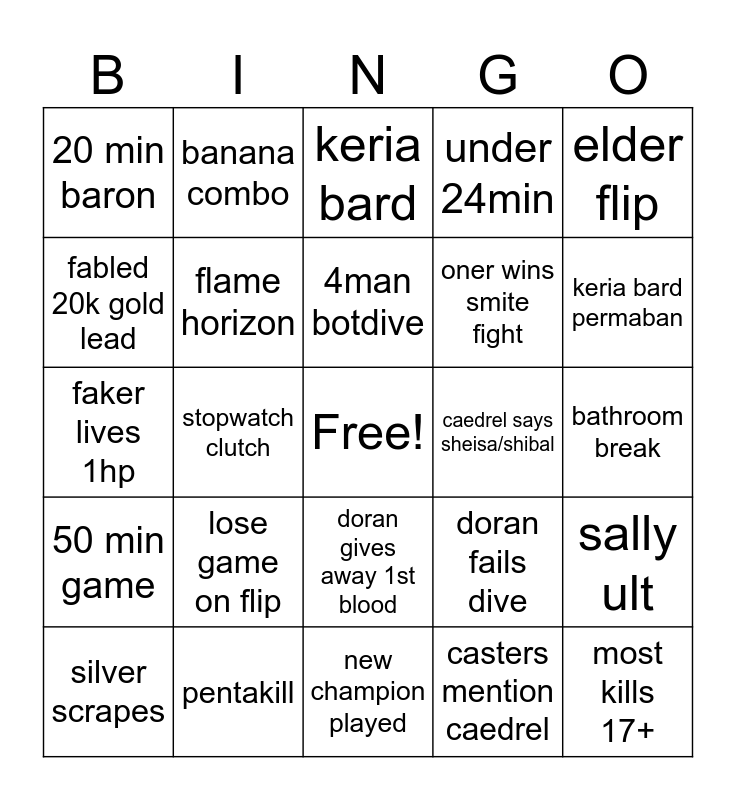This bingo card has a free space and 24 words: lose game on flip, pentakill, 4man botdive, silver scrapes, elder flip, 20 min baron, fabled 20k gold lead, banana combo, caedrel says sheisa/shibal, doran gives away 1st blood, oner wins smite fight, faker lives 1hp, doran fails dive, sally ult, flame horizon, casters mention caedrel, bathroom break, keria bard, keria bard permaban, stopwatch clutch, most kills 17+, 50 min game, under 24min and new champion played.