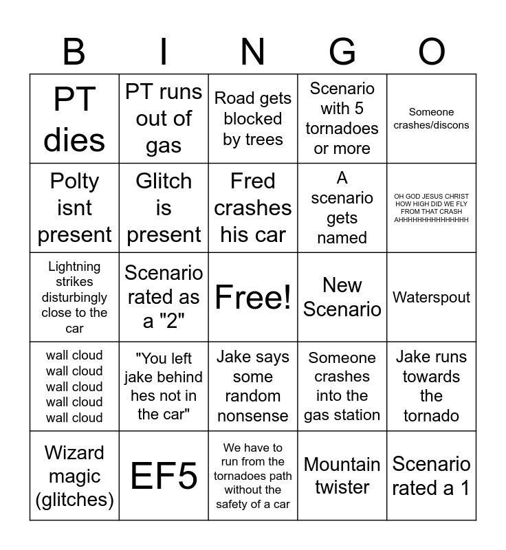 This bingo card has a free space and 24 words: "You left jake behind hes not in the car", EF5, Fred crashes his car, Wizard magic (glitches), Someone crashes/discons, PT dies, Polty isnt present, PT runs out of gas, New Scenario, Jake says some random nonsense, A scenario gets named, Lightning strikes disturbingly close to the car, Someone crashes into the gas station, Jake runs towards the tornado, Glitch is present, Mountain twister, Waterspout, Road gets blocked by trees, OH GOD JESUS CHRIST HOW HIGH DID WE FLY FROM THAT CRASH AHHHHHHHHHHHHHHH, Scenario rated as a "2", Scenario rated a 1, wall cloud wall cloud wall cloud wall cloud wall cloud, Scenario with 5 tornadoes or more and We have to run from the tornadoes path without the safety of a car.