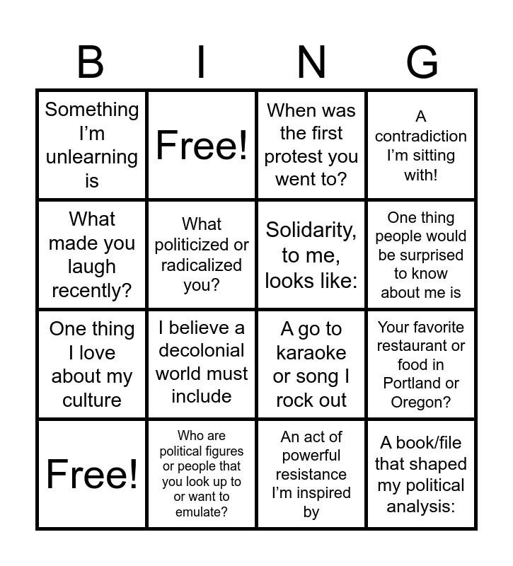 This bingo card has 16 words: Who are political figures or people that you look up to or want to emulate?, Your favorite restaurant or food in Portland or Oregon?, When was the first protest you went to?, Something I’m unlearning is, One thing I love about my culture, Free!, A go to karaoke or song I rock out, An act of powerful resistance I’m inspired by, What made you laugh recently?, What politicized or radicalized you?, Free!, A contradiction I’m sitting with!, I believe a decolonial world must include, One thing people would be surprised to know about me is, Solidarity, to me, looks like: and A book/file that shaped my political analysis:.