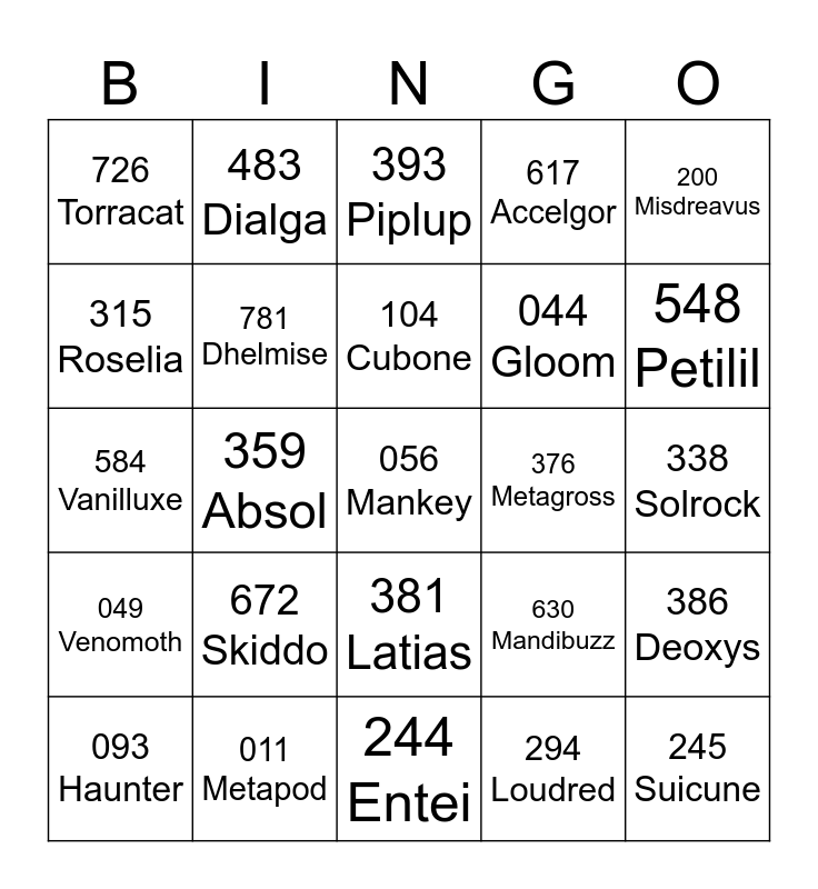 This bingo card has a free space and 24 words: 672 Skiddo, 011 Metapod, 104 Cubone, 093 Haunter, 200 Misdreavus, 726 Torracat, 315 Roselia, 483 Dialga, 376 Metagross, 381 Latias, 044 Gloom, 584 Vanilluxe, 630 Mandibuzz, 386 Deoxys, 781 Dhelmise, 294 Loudred, 338 Solrock, 393 Piplup, 548 Petilil, 359 Absol, 245 Suicune, 049 Venomoth, 617 Accelgor and 244 Entei.