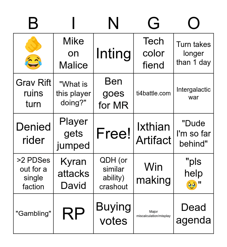 This bingo card has a free space and 24 words: Kyran attacks David, RP, Ben goes for MR, "Gambling", Turn takes longer than 1 day, 🫵😂, Grav Rift ruins turn, Mike on Malice, Ixthian Artifact, QDH (or similar ability) crashout, ti4battle.com, Denied rider, Win making, "pls help 🥹", "What is this player doing?", Major miscalculation/misplay, "Dude I'm so far behind", Inting, Intergalactic war, Player gets jumped, Dead agenda, >2 PDSes out for a single faction, Tech color fiend and Buying votes.