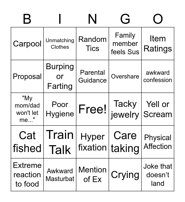 This bingo card has a free space and 24 words: Train Talk, Awkward Masturbat, Parental Guidance, Extreme reaction to food, Item Ratings, Carpool, Proposal, Unmatching Clothes, Tacky jewelry, Hyper fixation, Overshare, "My mom/dad won't let me...", Care taking, Physical Affection, Burping or Farting, Crying, Yell or Scream, Random Tics, awkward confession, Poor Hygiene, Joke that doesn’t land, Cat fished, Family member feels Sus and Mention of Ex.