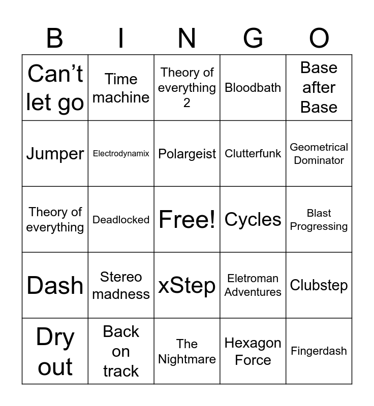 This bingo card has a free space and 24 words: Stereo madness, Back on track, Polargeist, Dry out, Base after Base, Can’t let go, Jumper, Time machine, Cycles, xStep, Clutterfunk, Theory of everything, Eletroman Adventures, Clubstep, Electrodynamix, Hexagon Force, Blast Progressing, Theory of everything 2, Geometrical Dominator, Deadlocked, Fingerdash, Dash, Bloodbath and The Nightmare.