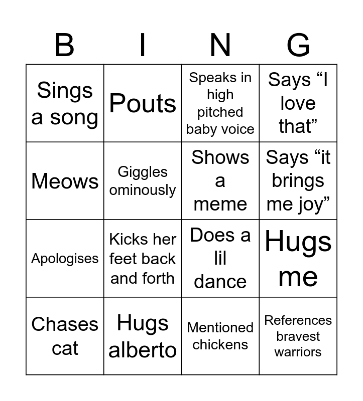 This bingo card has 16 words: Hugs alberto, Hugs me, Speaks in high pitched baby voice, Sings a song, Apologises, Pouts, Does a lil dance, Mentioned chickens, Meows, Giggles ominously, Chases cat, Says “I love that”, Kicks her feet back and forth, Says “it brings me joy”, Shows a meme and References bravest warriors.