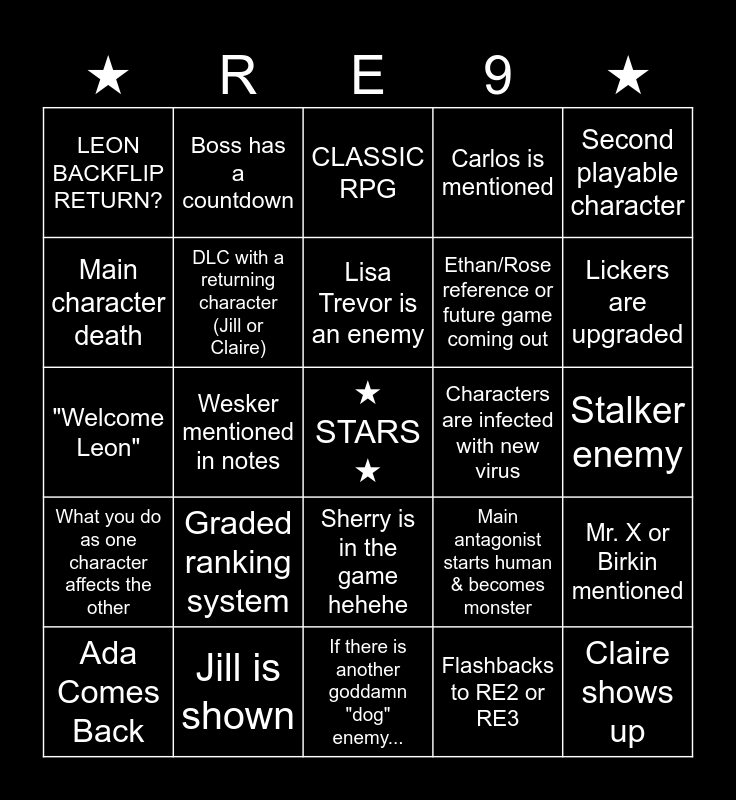 This bingo card has a free space and 24 words: Ada Comes Back, Graded ranking system, Lisa Trevor is an enemy, Flashbacks to RE2 or RE3, Second playable character, LEON BACKFLIP RETURN?, Boss has a countdown, CLASSIC RPG, Characters are infected with new virus, Stalker enemy, "Welcome Leon", DLC with a returning character (Jill or Claire), Main antagonist starts human & becomes monster, Mr. X or Birkin mentioned, Main character death, Jill is shown, If there is another goddamn "dog" enemy..., Carlos is mentioned, Lickers are upgraded, What you do as one character affects the other, Wesker mentioned in notes, Sherry is in the game hehehe, Ethan/Rose reference or future game coming out and Claire shows up.