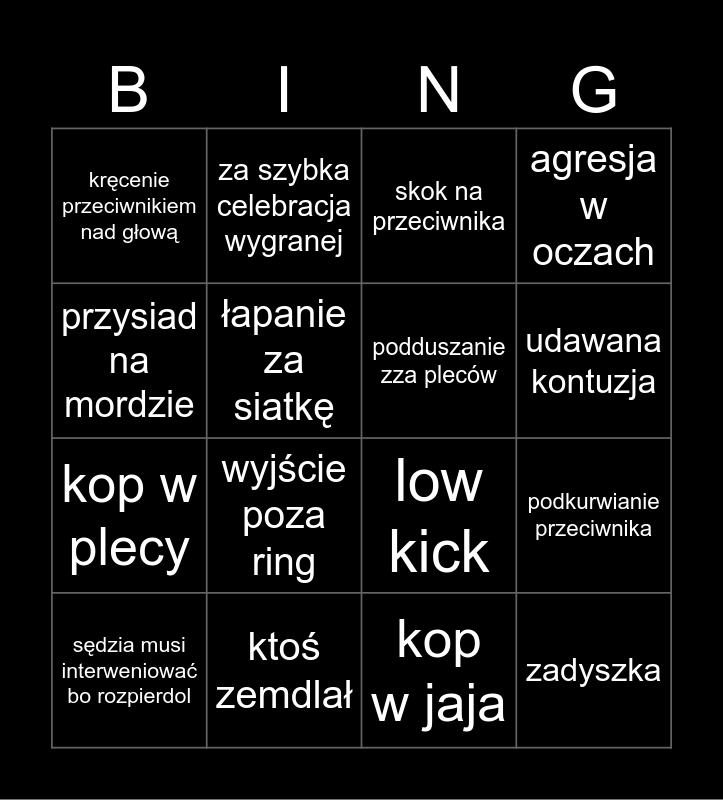 This bingo card has 16 words: ktoś zemdlał, podkurwianie przeciwnika, skok na przeciwnika, kręcenie przeciwnikiem nad głową, kop w plecy, za szybka celebracja wygranej, low kick, kop w jaja, przysiad na mordzie, łapanie za siatkę, sędzia musi interweniować bo rozpierdol, agresja w oczach, wyjście poza ring, udawana kontuzja, podduszanie zza pleców and zadyszka.