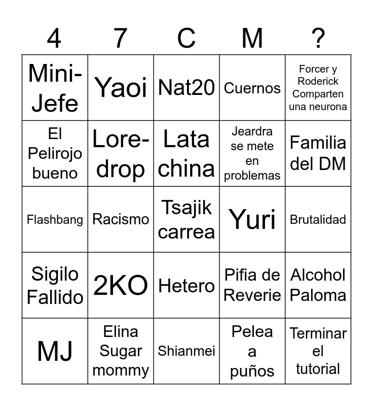 This bingo card has 25 words: 2KO, Shianmei, Lata china, MJ, Forcer y Roderick Comparten una neurona, Mini-Jefe, El Pelirojo bueno, Yaoi, Yuri, Hetero, Jeardra se mete en problemas, Flashbang, Pifia de Reverie, Alcohol Paloma, Lore-drop, Terminar el tutorial, Brutalidad, Nat20, Familia del DM, Racismo, Tsajik carrea, Elina Sugar mommy, Sigilo Fallido, Cuernos and Pelea a puños.