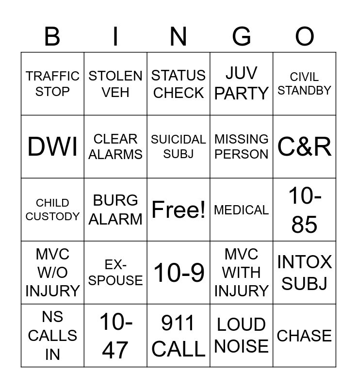 This bingo card has a free space and 30 words: 10-47, PHYSICAL DOM, BURG ALARM, FIRE, TRAFFIC STOP, STATUS CHECK, CLEAR ALARMS, 10-9, MEDICAL, 911 CALL, 10-85, CHASE, LOUD NOISE, CHECK WELFARE, C&R, WARRANT, MVC WITH INJURY, MVC W/O INJURY, EX-SPOUSE, CIVIL STANDBY, CHILD CUSTODY, SUBJ REMOVAL, STOLEN VEH, MISSING PERSON, DWI, JUV PARTY, INTOX SUBJ, NS CALLS IN, SUICIDAL SUBJ and CALLS ABOUT MOM.