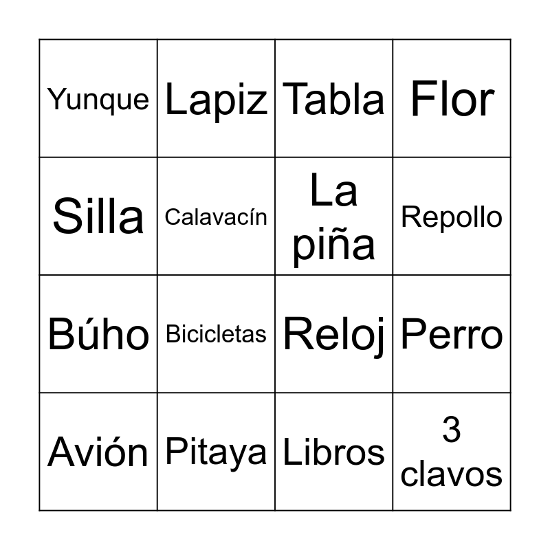 This bingo card has 20 words: Perro, Teléfono, Tabla, Trompo, Avión, Silla, Pitaya, Yunque, Búho, Lapiz, Bicicletas, Reloj, Calavacín, 3 clavos, La piña, Tijera, Repollo, Flor, Libros and Triangulo.